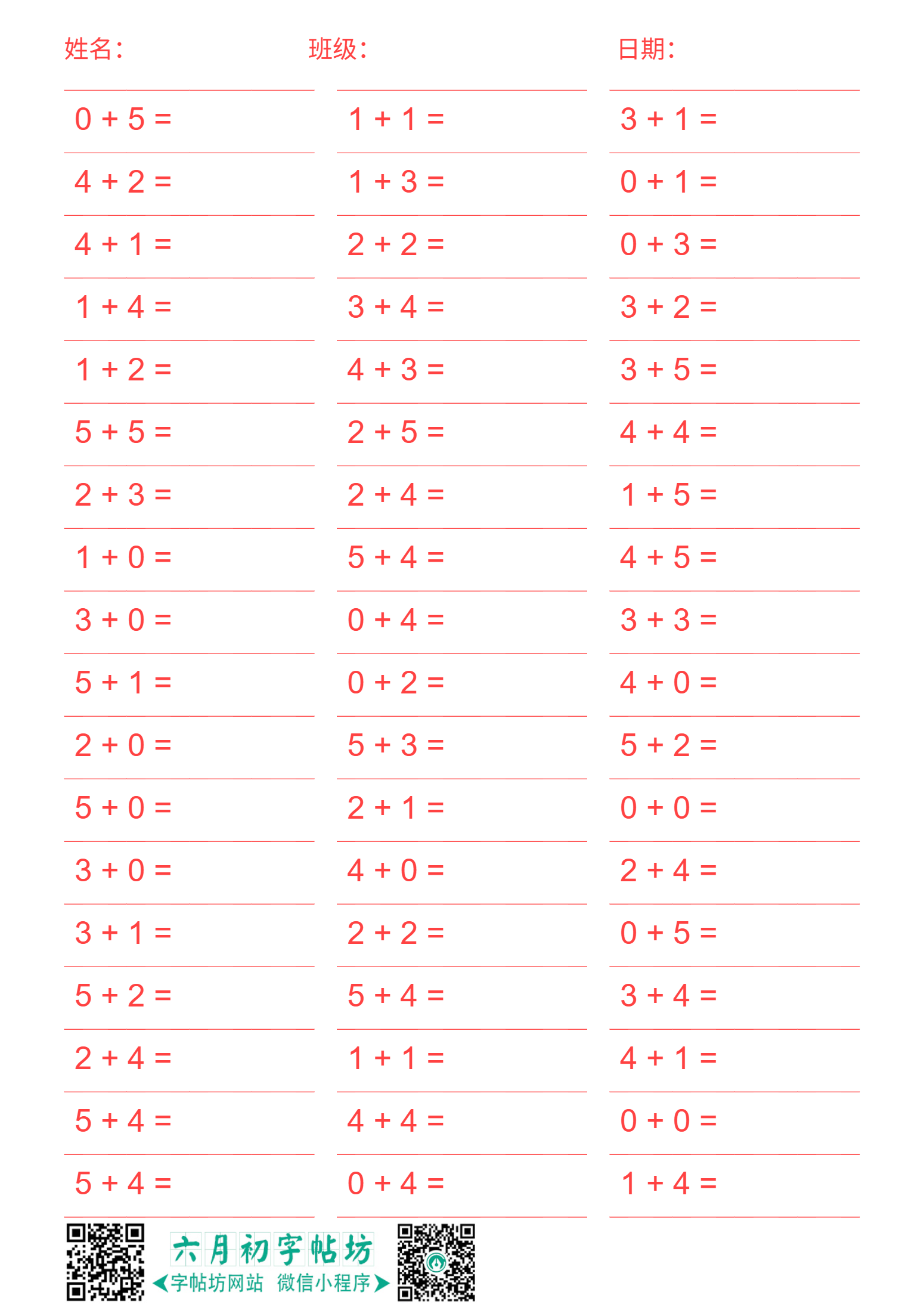 网页版本:搜索或点击网站“六月初字帖坊”,选择对应算术题一键生成,在线打印,完全免费!